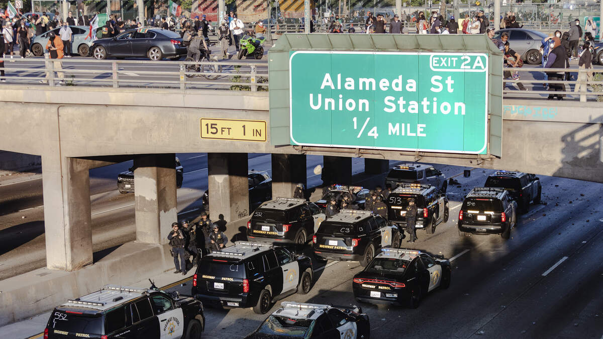 Around 7:30 p.m. Sunday, police shut down the Hollywood (101) Freeway for the second time that day due to protesters on an overpass throwing rocks, debris and firecrackers at California Highway Patrol officers and vehicles in southbound lanes, causing severe damage to the vehicles.